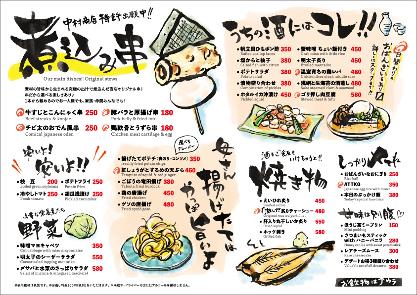 「大衆酒場 中村商店」様 グランドメニュー・看板類・のれんの制作